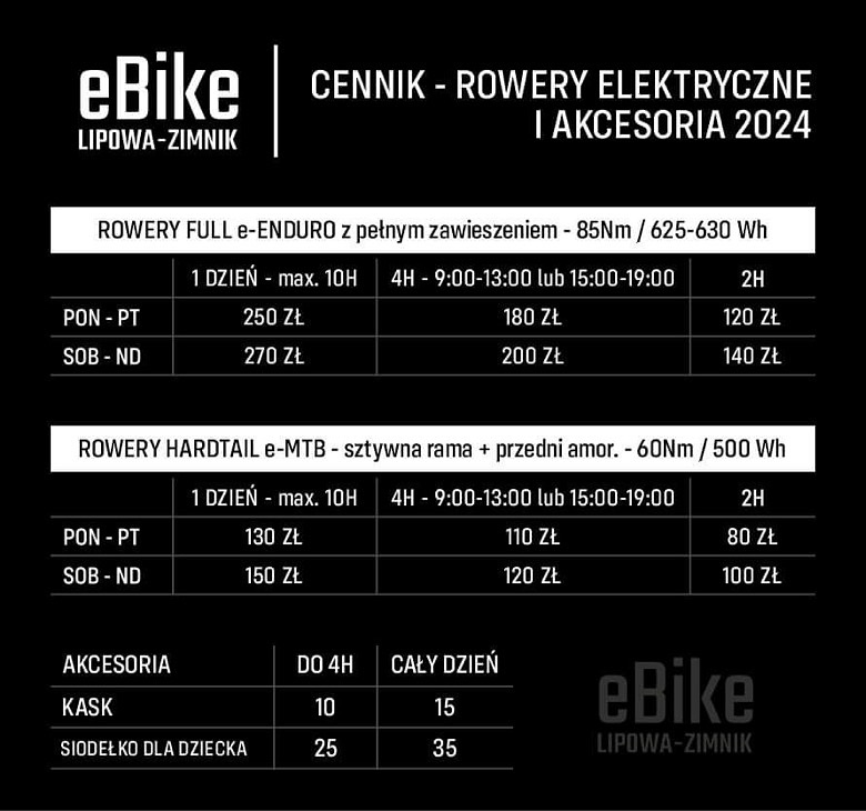 Wypożyczalnia rowerów elektrycznych typu e-Enduro i Hardtail, dostępnych na 2h, 4h lub cały dzień.